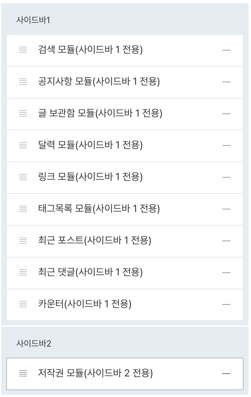 기본 모듈 중 사이드바 1과 2에 적용되는 모듈의 코드 구성이 다릅니다.